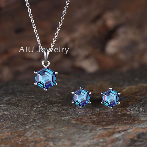925 चांदी के हेक्सागन कट लैब ने एल्क्सएंड्रेट क्रिसोबेरिल हार गहने सेट अनुकूलन योग्य